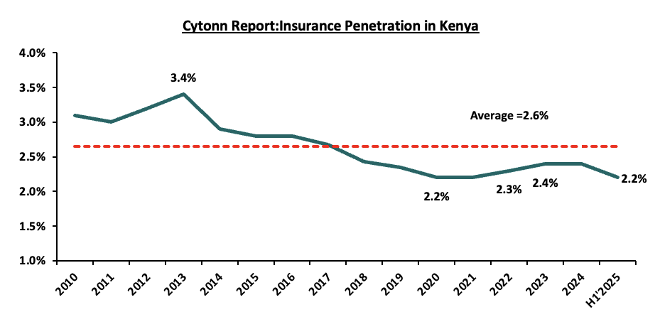 Insurance uptake in Kenya remains low compared to other key economies with the insurance penetration coming in at 2.2% as at H1’2025, according to Q2’2025 Insurance Regulatory Authority (IRA) and Central Bank of Kenya. The low penetration rate, which is below the global average of 7.4%, according to Allianz Global Insurance Report 2025, is attributable to the fact that insurance uptake is still seen as a luxury and mostly taken only when it is necessary or a regulatory requirement. Notably, insurance penetration declined by 0.2% points from 2.4% recorded in 2024, despite the mild economic recovery that saw a slight improved business environment in the country with the Stanbic Purchasing Managers Index for H1’2025 coming in at 50.5, up from 50.0 in H1’2024. The chart below shows Kenya’s insurance penetration for the last 15 years: