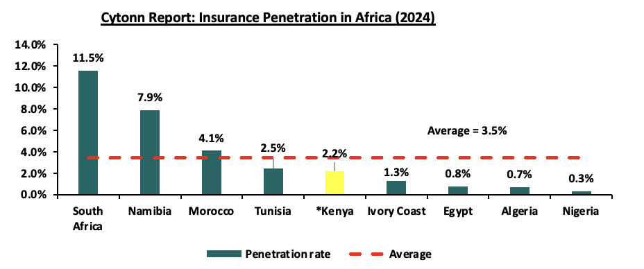 Insurance penetration in Africa has remained relatively low, averaging 3.5% in 2024, mainly attributable to lower disposable income in the continent and slow growth of alternative distribution channels such as mobile phones to ensure wider reach of insurance products to the masses. South Africa remains the leader in insurance penetration in the continent, owing to a mature and highly competitive market, coupled with strong institutions and a sound regulatory environment.