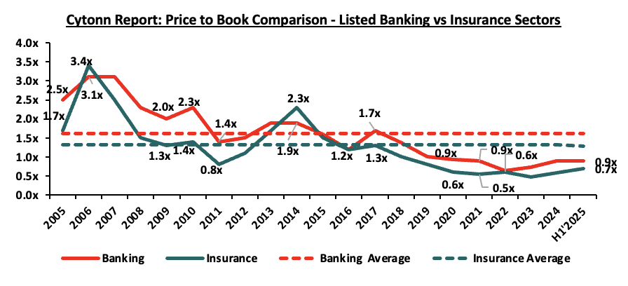 On valuations, listed insurance companies are trading at a price to book (P/Bv) of 0.7x, lower than listed banks at 0.9x, but both are lower than their 16-year historical averages of 1.3x and 1.6x, for the insurance and banking sectors respectively. These two sectors are attractive for long-term investors supported by the strong economic fundamentals. The chart below shows the price to book comparison for Listed Banking and Insurance Sectors:
