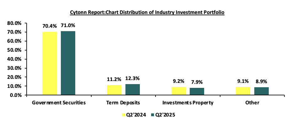 Government securities grew by 20.3% to Kshs 855.6 bn in Q2’2025, up from Kshs 711.5 bn in Q2’2025. Insurers increased their portfolios to in government securities despite the declining yields. The share of government securities rose 0.6% points year-on-year to 71.0% in Q2’2025 from 70.4% in Q2’2024 attributable to low risk profile from government securities. Investments in term deposits increased by 30.1% points to Kshs 147.8 bn in Q2’2025, up from 113.6 bn in Q2’2024 with the allocation increasing by 1.1% to 12.3%, from 11.2% in Q2’2024.Investment property increased by 1.8% to Kshs 94.7 bn in Q2’2025 ,up from Kshs 93.0 bn in Q2’2024 ,while the allocation of the portfolio declined by 1.3% points to 7.9%, from 9.2% in Q2’2024. The chart below shows comparison of investments portfolio allocations for the industry: