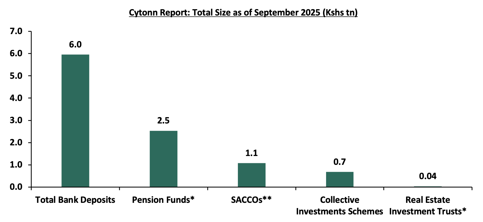 In Kenya, pension funds hold a substantial share of financial assets, consistently growing due to mandatory and voluntary contributions under the National Social Security Fund (NSSF) Act of 2013 regulations. In comparison, bank deposits remain the largest financial pool, reflecting their role as the primary savings vehicle driven by their liquidity, security, and accessibility, though they offer lower returns. Capital markets products, including unit trusts, REITs, are relatively smaller highlighting the nascent stage of capital markets in Kenya, but expanding as investors seek diversification and higher yields. Key to note, the Collective Investments Scheme’s industry’s overall Assets under Management (AUM) grew by 14.0% quarter‑on‑quarter to Kshs 679.6 bn in Q3’2025 from Kshs 596.3 bn in Q2’2025, while on a year‑on‑year basis AUM rose by 114.8% from Kshs 316.4 bn in Q3’2024. SACCOs play a crucial role in cooperative-based savings and credit access, especially for middle-income earners.