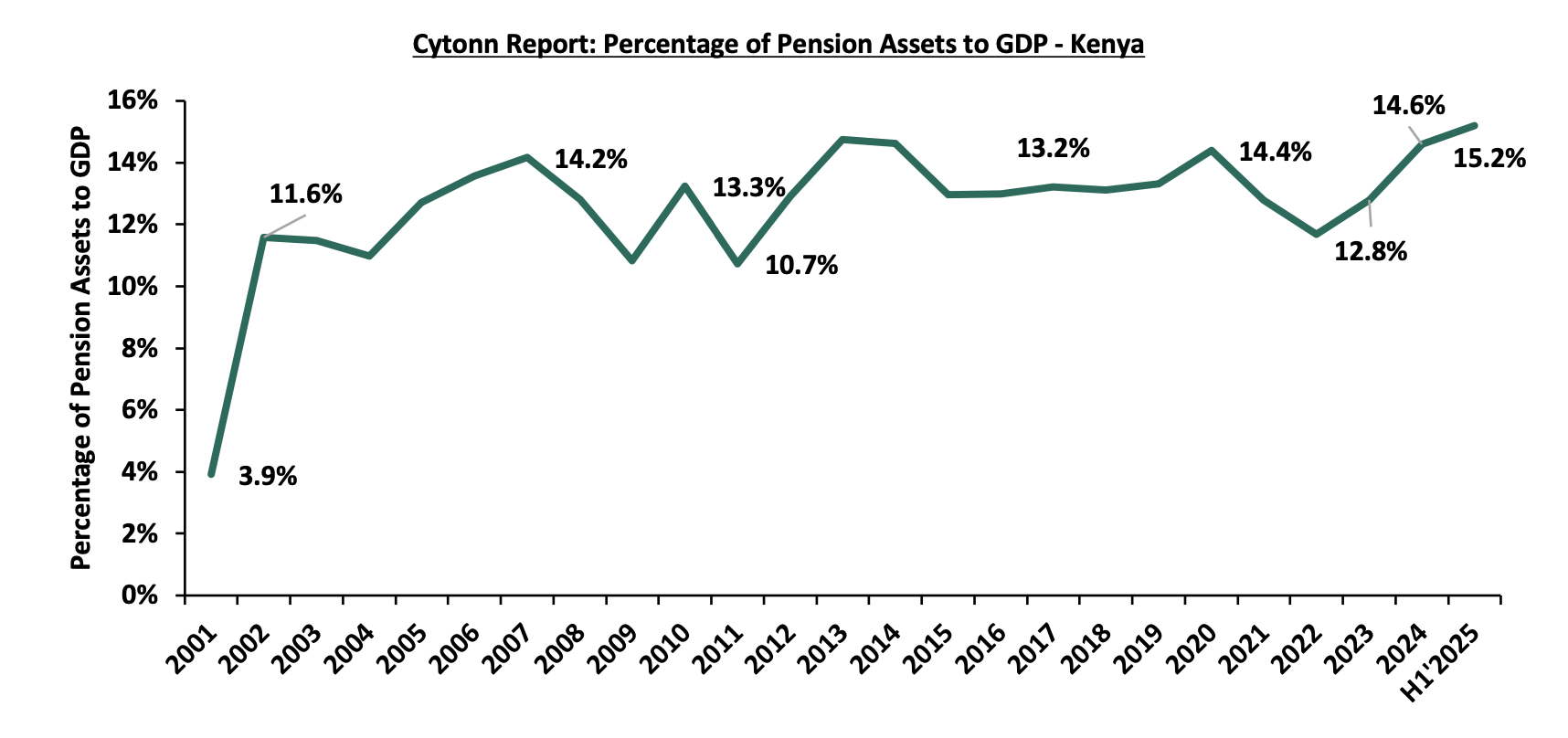 As of the latest available data by RBA, Kenya’s pension-to-GDP ratio increased by 0.6% points to 15.2% in H1’2025 from 14.6% in 2024, driven by a 12.2% increase in pension Assets Under Management (AUM) to Kshs 2.5 bn, significantly outpacing the country’s GDP growth rate, which recorded a growth of 5.0% in Q2’2025, compared to 4.7% in FY’2024. This disparity implies that the pension sector is expanding at a much faster rate than the broader economy, reflecting stronger savings mobilization, improved investment returns, and possibly increased compliance or contribution levels following regulatory reforms. However, the 15.2% is significantly lower than that of developed countries such as the United States at 169.5%, Australia at 132.6%, and the United Kingdom at 124.2%, reflecting the maturity and depth of their pension systems. In Sub-Saharan Africa region, Kenya outperforms countries like Malawi at 11.7%, Uganda at 9.0% and Nigeria at 8.0%, but still lags behind Namibia at 100.4% and South Africa at 83.8%. This positioning indicates that while Kenya’s pension sector is growing steadily, particularly with recent reforms, there remains considerable room for expansion and deeper integration into the national economy. The graph below shows select countries’ pension assets to GDP ratio as per the latest published data by World Bank: