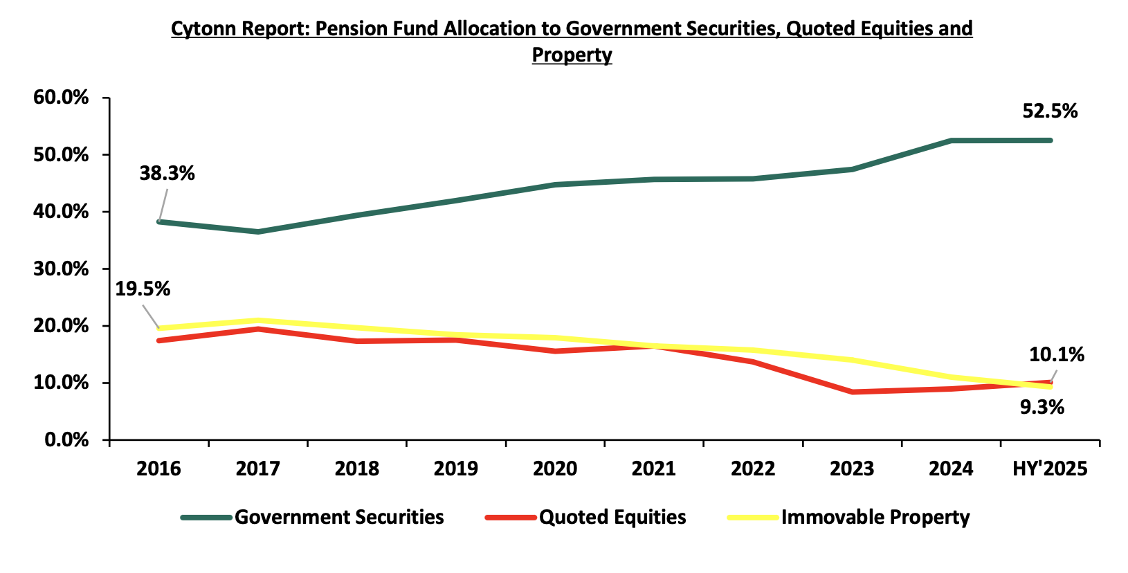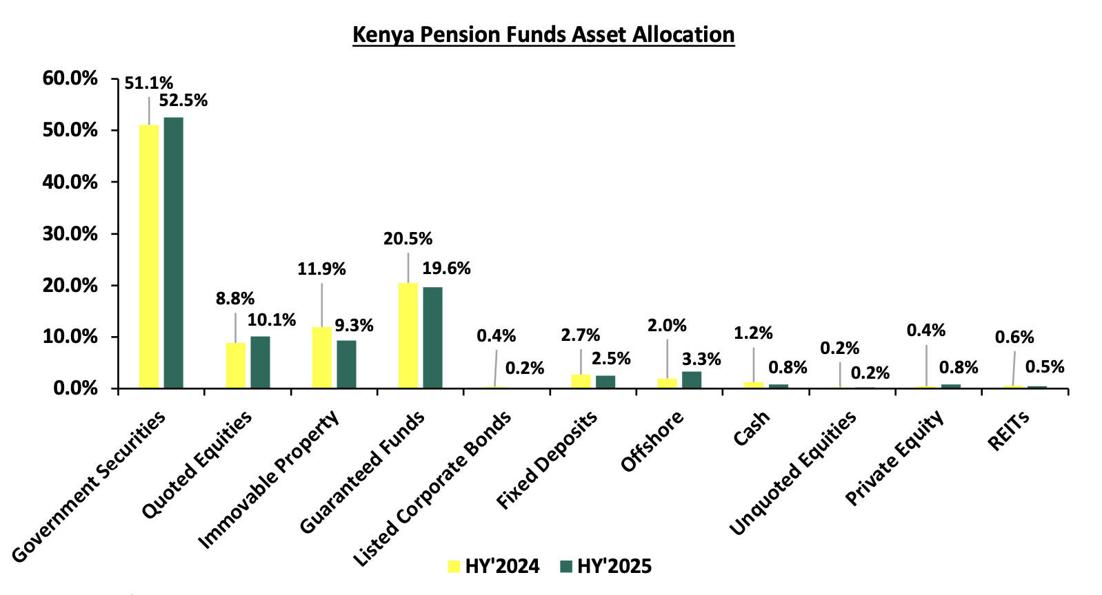 - The allocation towards quoted equities increased by 1.1% points to 10.1% in H1’2025, from 9.0% in FY’2024 on the back of improved performance in the Kenyan equities market as evidenced by 22.4% gain by the NASI index in H1’2025, driven by a recovery in corporate earnings and increased investor confidence. Favourable macroeconomic conditions, such as stable inflation and a stable shilling, boosted market sentiment, have encouraged trustees to allocate more funds to equities during the period, and,