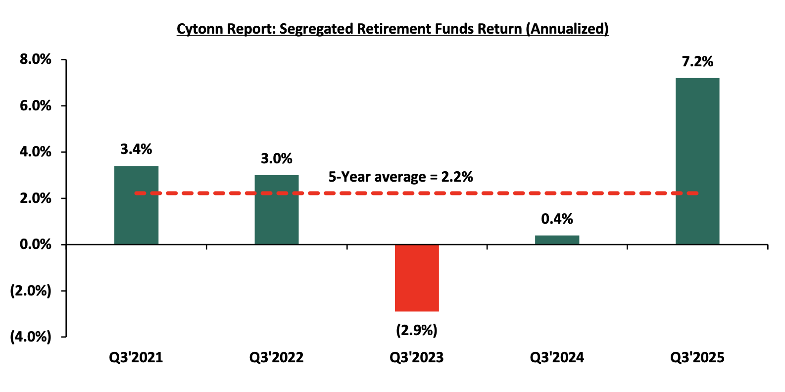 According to the ACTSERV Q3’2025 Pension Schemes Investments Performance Survey, the five-year average return for segregated schemes over the period 2021 to 2025 was 2.2% with the performance fluctuating over the years to a high of 7.3% in Q3’2025, and a loss of 2.9% in Q3’2023 reflective of the markets performance. Notably, segregated retirement benefits scheme returns increased to 7.2% return in Q3’2025, up from the 0.4% gain recorded in Q3’2024. The y/y growth in overall returns was largely driven by the 17.5% points increase in returns from Equities to 19.6% from a gain of 2.1% in Q3’2024 attributable to the increased corporate earnings and attractive valuations as well as the 5.1% gain from fixed income. The 5.1% gain in Fixed Income returns was a 5.1% points increase from the 0.04% loss recorded in Q3’2024. The chart below shows the quarterly performance of segregated pension schemes since 2021: