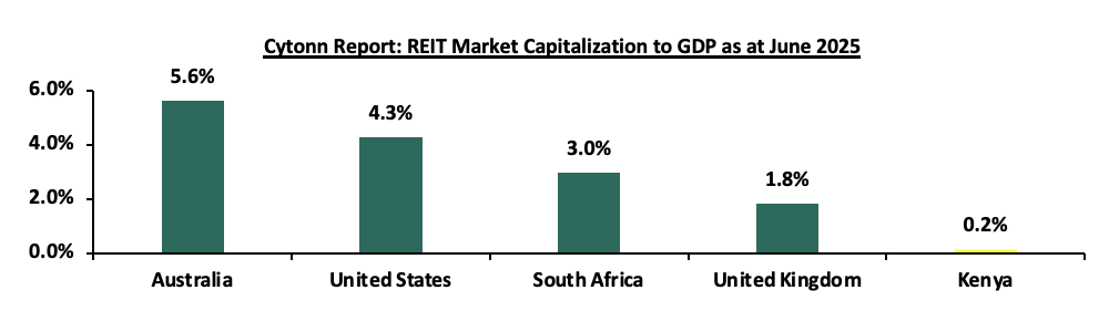 The underdeveloped capital markets in Kenya has continually failed to provide alternative means of financing Real Estate developments. Due to this, most property developers rely on conventional sources of funding such as banks, compared to other developed countries. As a result, Kenya’s REIT Market Capitalization to GDP has remained significantly low at 0.2%, compared to other countries such as South Africa with 3.0%, as shown below;