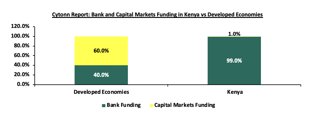 Kenya's Real Estate sector has been expanding due to ongoing construction activities driven by strong demand for real estate developments. The residential market is significantly under-supplied, with a 2.0 mn units housing deficit growing by 250,000 units per year; only 50,000 units are delivered annually against an estimated need for 200,000 units per year. Additionally, the formal retail market in Kenya is still in its nascent stages, with a penetration rate of approximately 30.0%, as reported by the World Bank. Despite the high demand, developers in Kenya encounter limited financing options, with local banks providing nearly 99.0% of construction financing, in stark contrast to the 40.0% typically seen in developed countries. The graph below illustrates the comparison of construction financing in Kenya versus developed economies;
