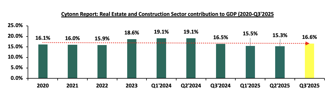 In 2025, the general Real Estate sector continued to witness considerable growth in activity in terms of property transactions and development activities. Consequently, the sector’s activity contribution to Gross Domestic Product (GDP) grew by 7.6% to Kshs 368.7 bn in Q3’2025, from Kshs 342.6 bn recorded during the same period in 2024. In addition, the sector contributed 8.6% to the country’s GDP, 0.2% points decrease from 8.8% recorded in Q3’2024. Cumulatively, the Real Estate and Construction sectors contributed 16.6% to GDP, 0.1 % points increase from 16.5% in Q3’2024, attributable to a surge in construction sector contribution to GDP by 9.3 % points, to 6.7% in Q3’2025, from a contraction of 2.6% recorded in Q3’2024. The graph below highlights the Real Estate and Construction sectors’ contribution to GDP from 2020 to Q3’2025;